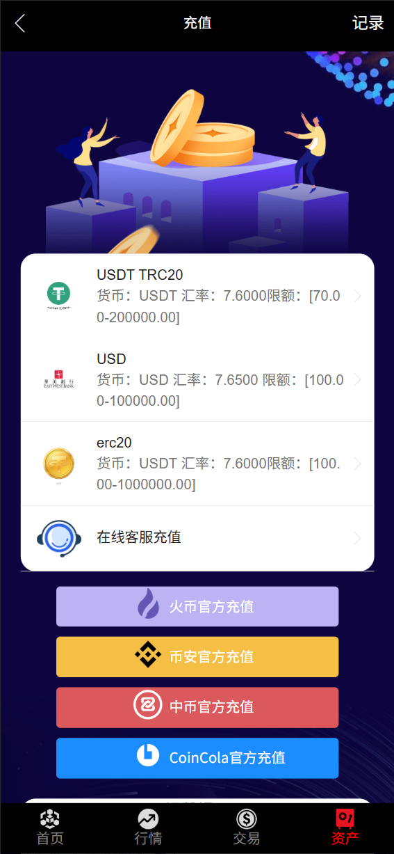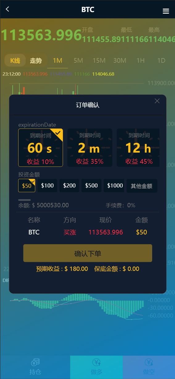 系统功能:全新UI界面,秒合约,充值界面包含USDT,银行,交易所多种充值方式,后台可群控和单控