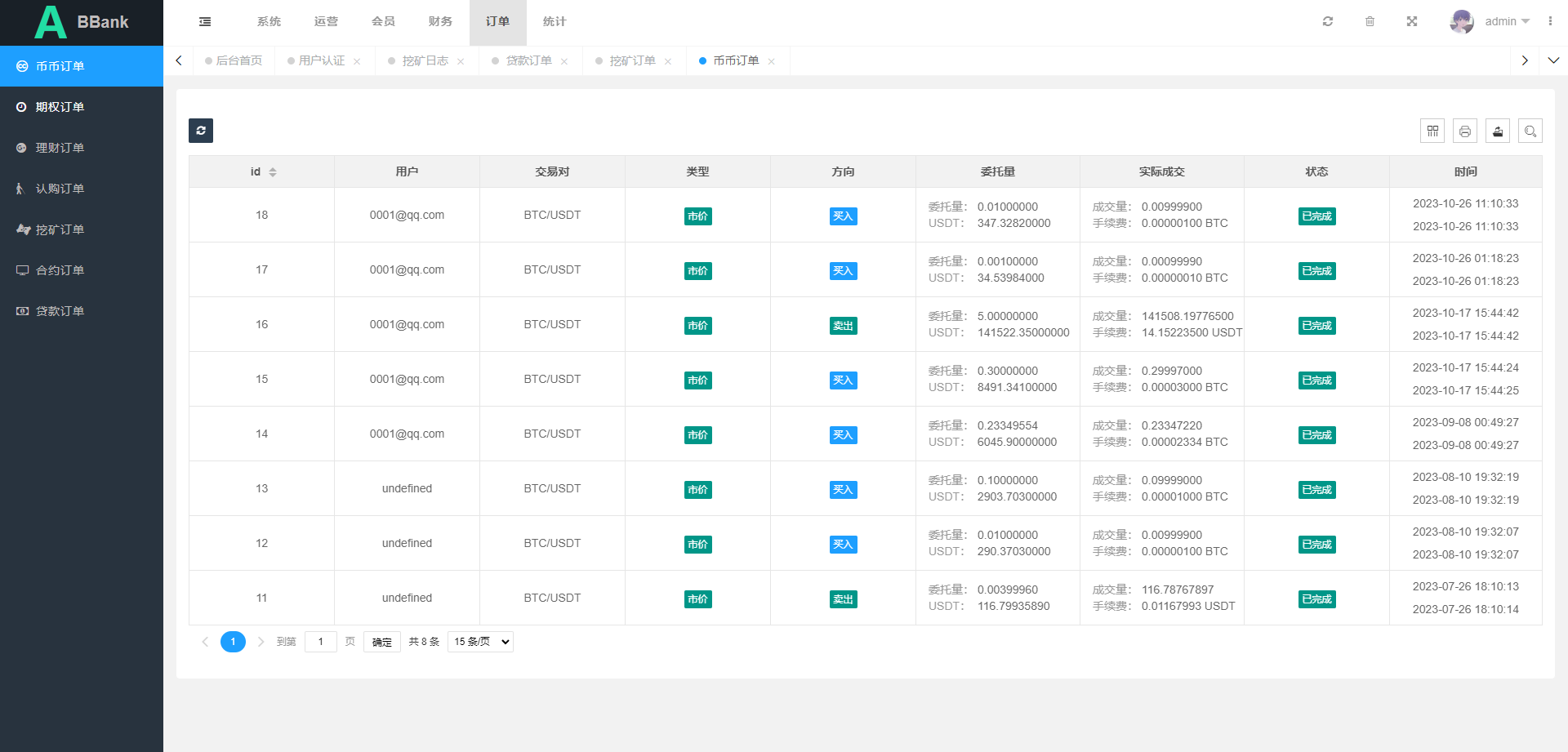 购买合约订单后台订单可以看到用户买过之后余额方便控单