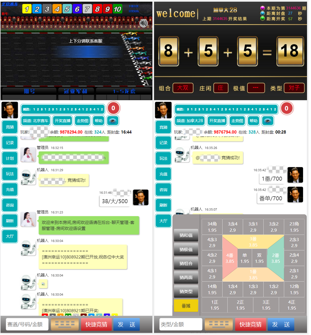 包括pc28游戏:极速28,加拿大28,台湾宾果28,纽约28.。经典彩票:百家乐,香港六合彩,时时彩,北京赛车飞艇,劲爆摩托等,玩法多样,无限开房,带控制机器人。