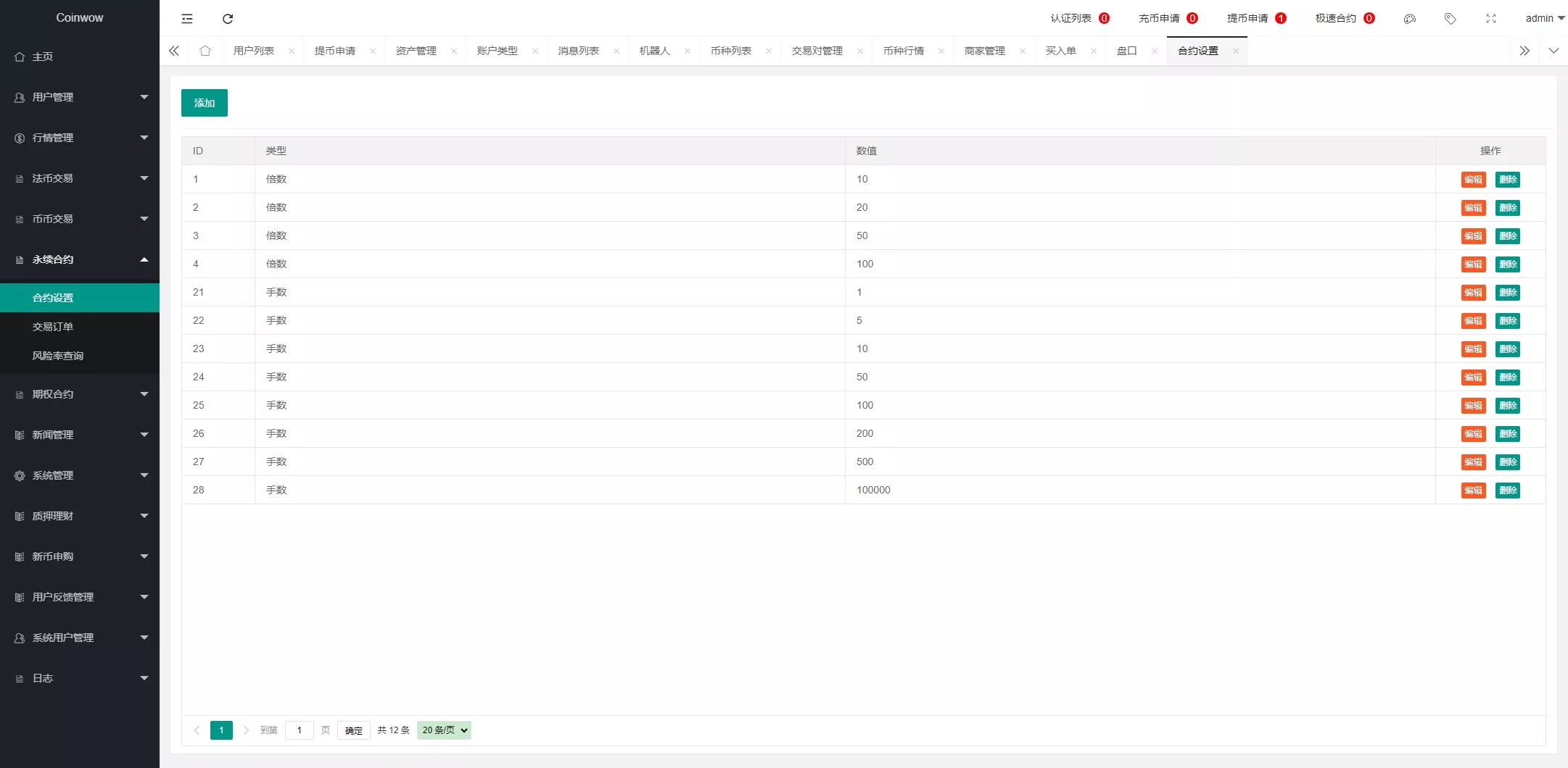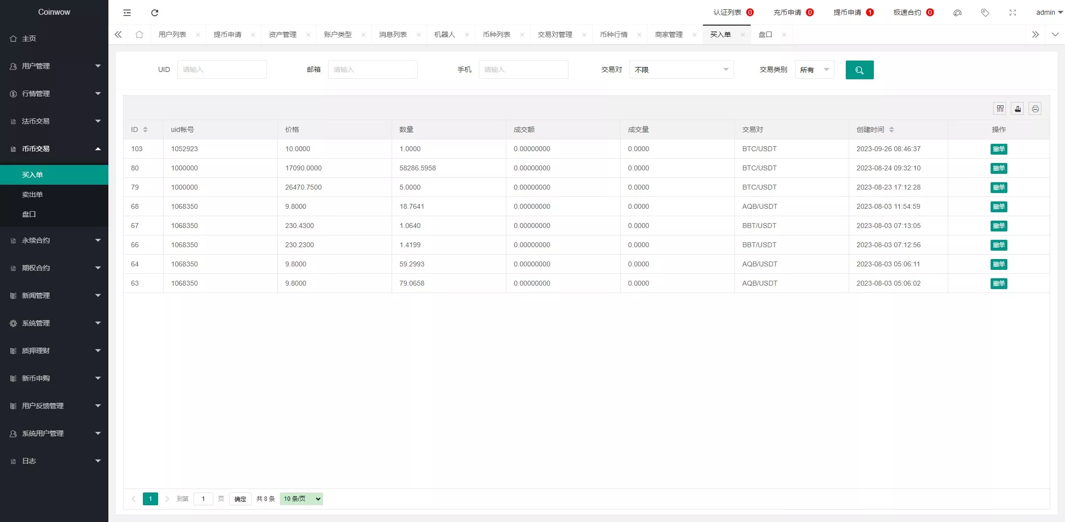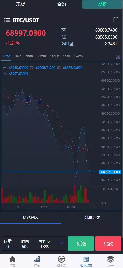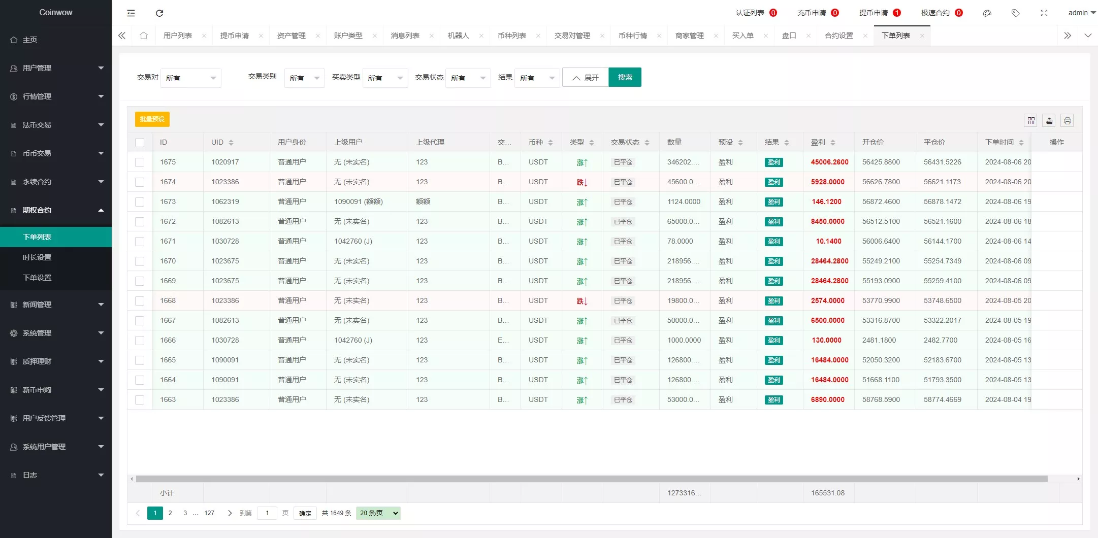 支持产品:虚拟币,期权交易,合约交易,质押挖矿,认购等功能,支持用户单控,期权订单控制